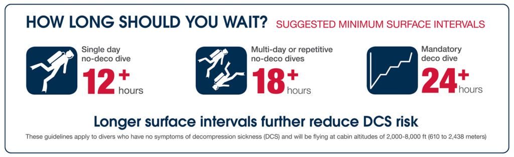 • Flying After Diving: A surface interval of 12 to 24 hours after your last dive is mandatory before flying.