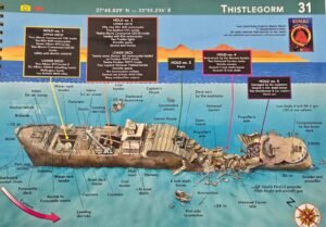 To reach this iconic “Old Lady”, boats leave early from Sharm El Sheikh; the crossing can take up to 3.5 hours. Most trips include two dives—one outside (orientation/swim-around) and one inside (guided penetration of the cargo holds). Currents can be strong and the average depth is ~24 m (generally deeper than 18 m). Divers should have confident buoyancy, hold a 30 m certification (Advanced Open Water or equivalent), and use Nitrox on both dives to extend no-decompression limits.