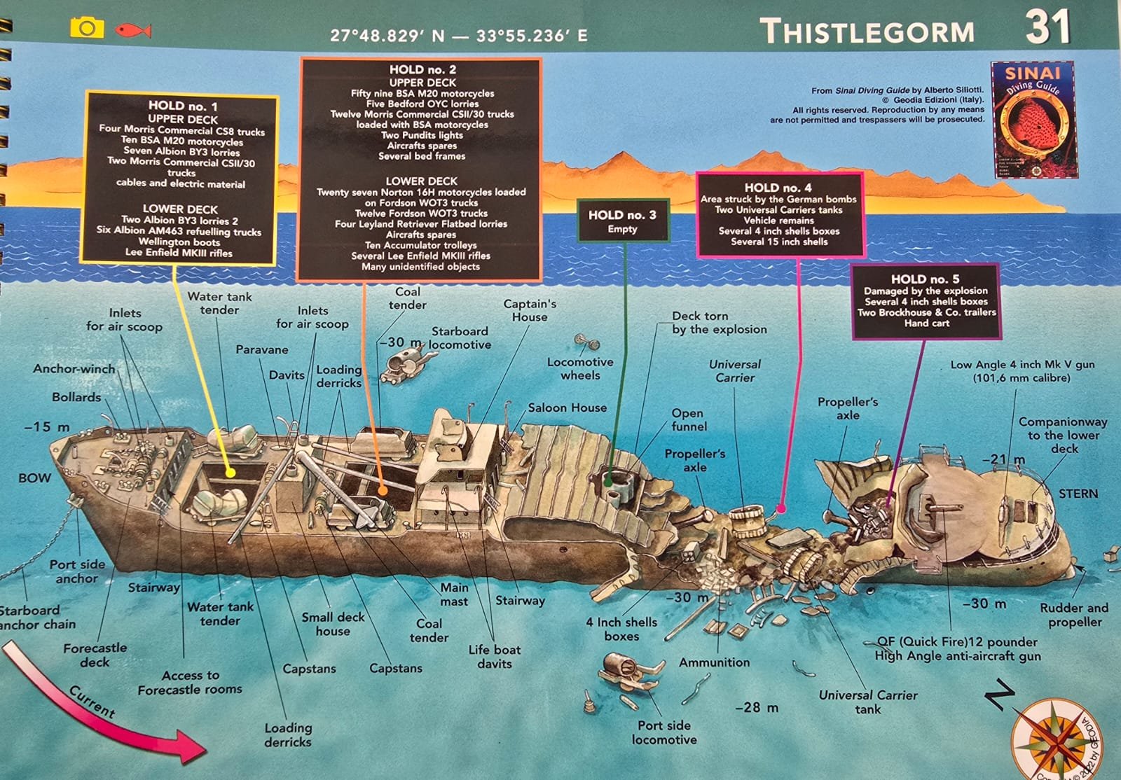 Built in Sunderland, UK, in 1940, the SS Thistlegorm was a British merchant ship classified as an armed freighter. She sailed from England around the Cape of Good Hope and through the Suez Canal bound for Alexandria, Egypt. On the night of 6 October 1941, during WWII, two Heinkel He 111 bombers dropped two 2.5-tonne high-explosive bombs that sank the vessel. In the 1950s, Jacques Cousteau located the wreck with help from local fishermen.