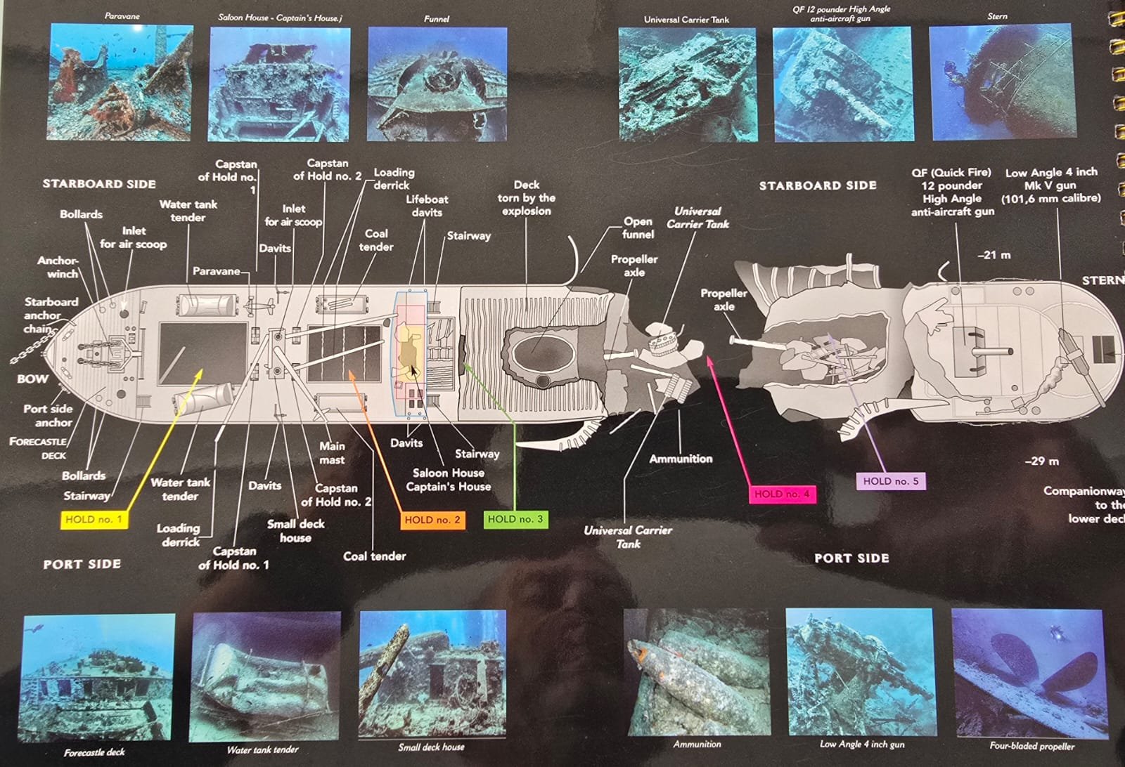 Today the cargo turns the site into an underwater museum. Inside the holds are Bedford trucks, Universal Carrier armoured vehicles, Norton 16H and BSA motorcycles, aircraft wings for Westland Lysanders, cases of ammunition, Lee-Enfield Mk III rifles, and Wellington boots. Outside, you’ll find four Bren gun carriers, LMS Stanier Class 8F steam locomotives with coal and water tenders, a 3-inch light anti-aircraft gun, and a 4-inch cannon from WWI, reportedly test-fired only once.