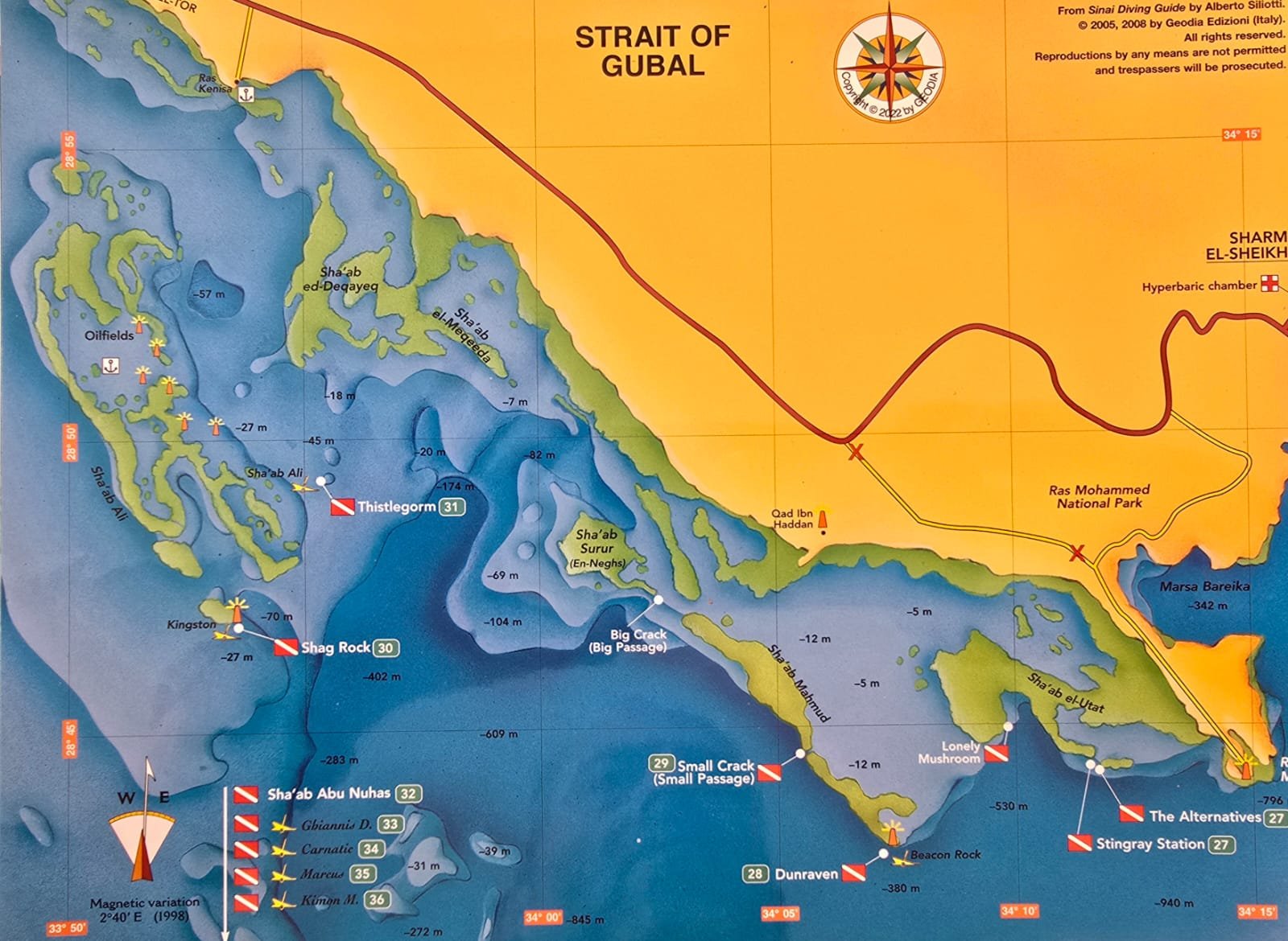 OW (AOW recommended) 18m+ Similar to Ras Mohammed, sheltered areas are fine for OW divers. The renowned reef walls and strong currents in the straits (Jackson ReefThomas Reef) are best suited for AOW divers.